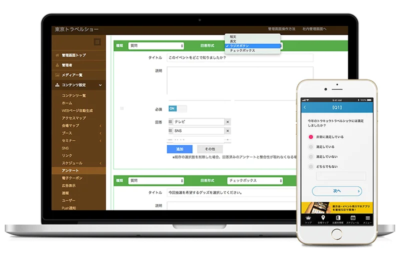イベント全体の満足度調査から、セッションごとの個別アンケートまで柔軟に設定可能。回答データはユーザー属性と紐づいて集計されるため、より深い分析が可能です。