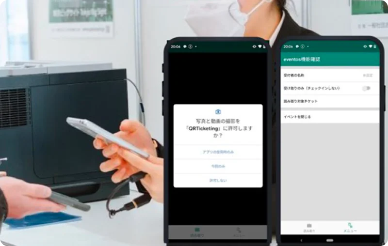 事前に発行されたQRコードをスマートフォンやタブレットにかざすだけで受付が完了。