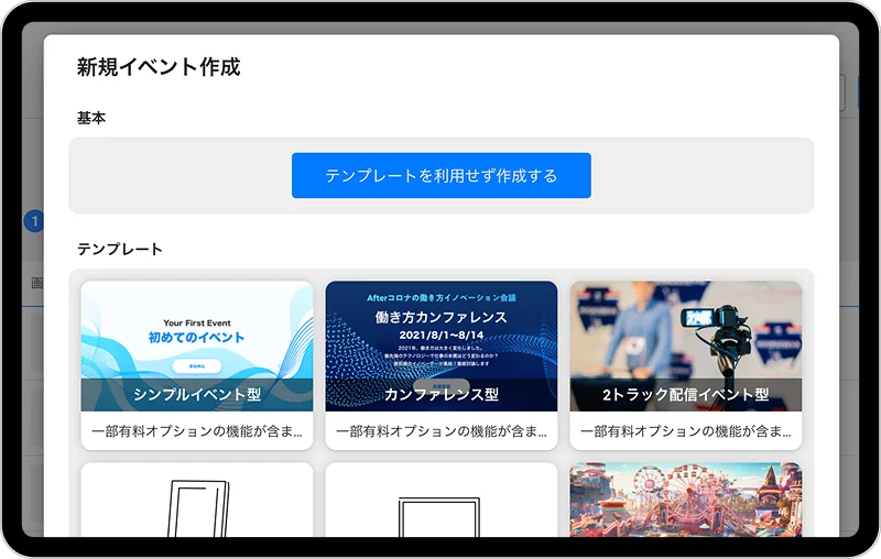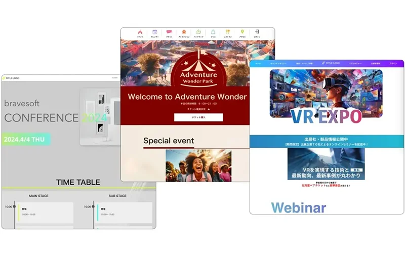 カンファレンス、展示会など、多様なシーンに最適化されたデザインテンプレートを用意。目的に合わせた型を選ぶだけで、構成に迷うことなくスピーディーに立ち上げが可能です。
