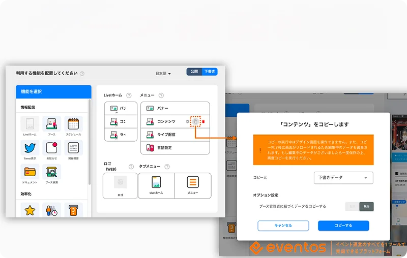 過去に開催したイベントサイトの設定やコンテンツを丸ごとコピーして、新しいイベントを作成できます。シリーズ開催や定例セミナーなど、運用の効率化を極限まで高めます。