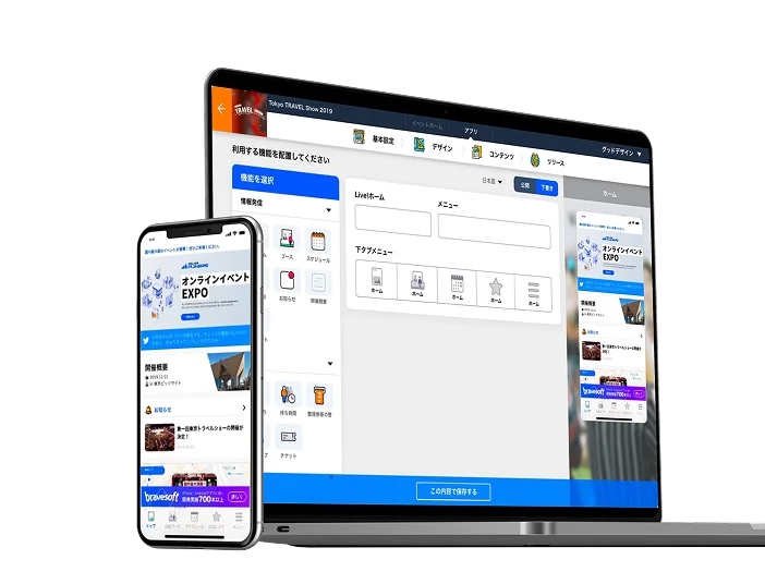 専門知識がなくても、ドラッグ&ドロップ感覚の直感的な操作で、PC・スマホに完全対応したプロ仕様のイベント特設サイトを構築できます。Webとアプリが連動しているため、情報の更新も一度の操作で完了します。